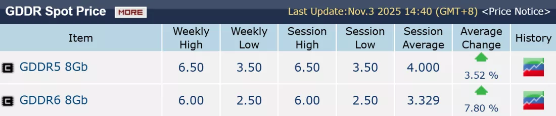 然而,我们目前在DRAM市场看到的并非“典型的价格波动”,而是大幅上涨。至少根据DRAM Exchange的数据,GDDR的价格尚未出现像DDR5那样的极端涨幅,但GDDR6的现货价格正在上涨。