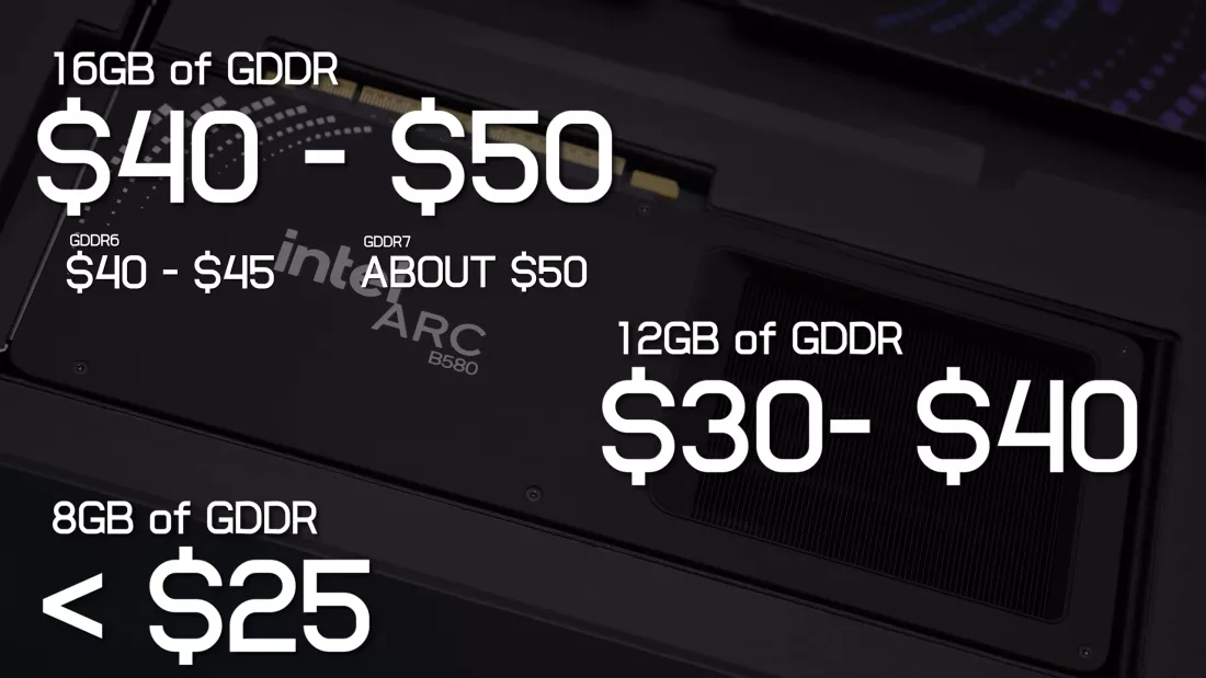 这意味着,按照通常的基准定价,为显卡增加 16GB GDDR 显存的成本大约在 40 美元到 50 美元之间。GDDR6 的价格通常在 40 美元出头,而 GDDR7 的价格则接近 50 美元。像RTX 5070或Arc B580这样配备 12GB 显存的显卡,其 GDDR 显存的成本会更低一些,大约在 30 美元到 40 美元之间。而配备 8GB 显存的 GPU,其显存成本则不到 25 美元。
