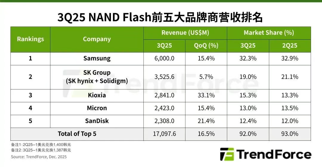 根据TrendForce=最新调查,2025年第三季因云端服务业者(CSP)持续扩建AI基础建设,对Enterprise SSD(企业级SSD)需求强劲,带动前五大NAND Flash品牌商合计营收季增16.5%,逼近171亿美元。上半年的减产措施奏效,下半年供需失衡情况获得改善,加上Enterprise SSD销售占比提高,各原厂的平均销售单价(ASP)皆有上涨。