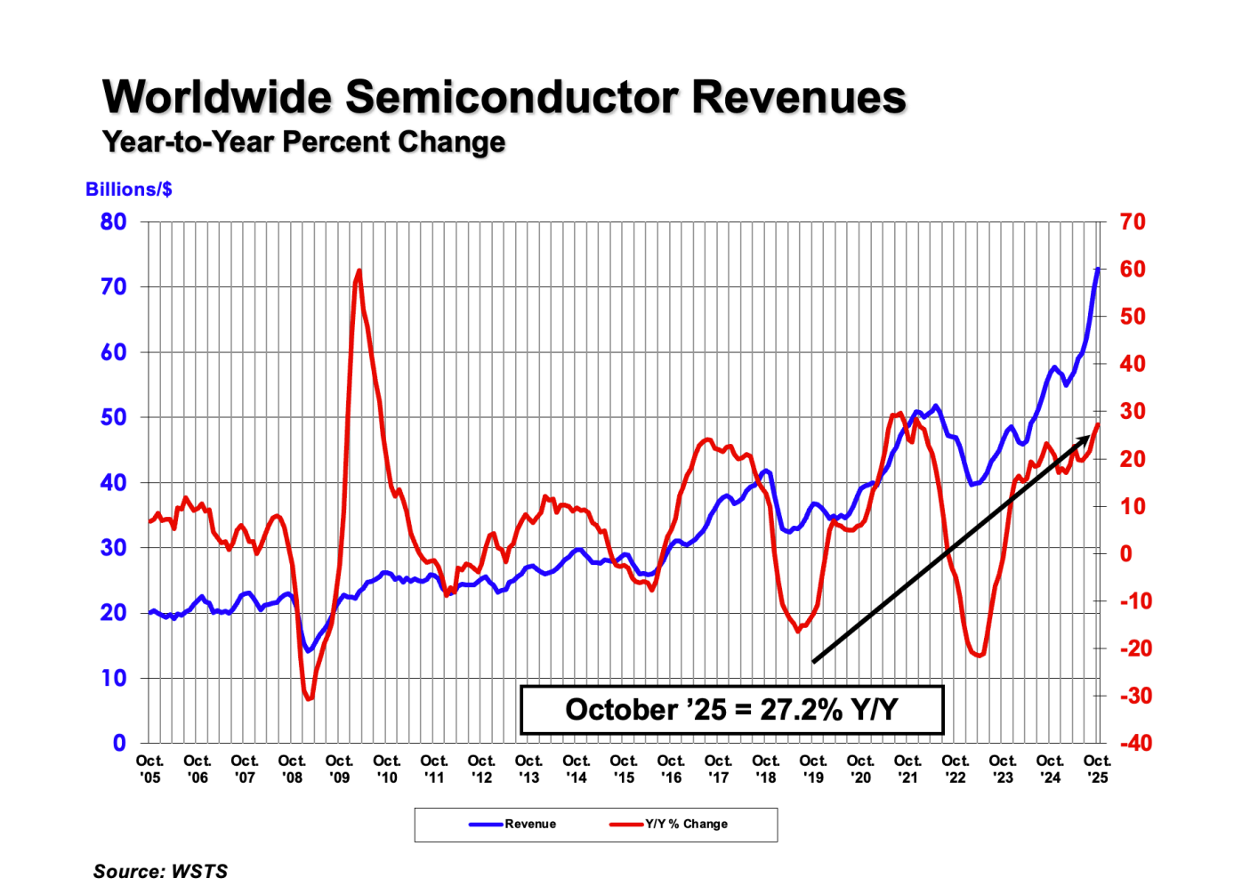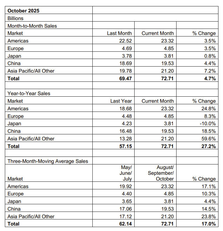 美国半导体行业协会(SIA)宣布,2025年10月全球半导体销售额为727亿美元,较2025年9月的695亿美元增长4.7%,较2024年10月的572亿美元增长27.2%。月度销售额数据由 世界半导体贸易统计组织(WSTS)统计 ,并采用三个月移动平均值。