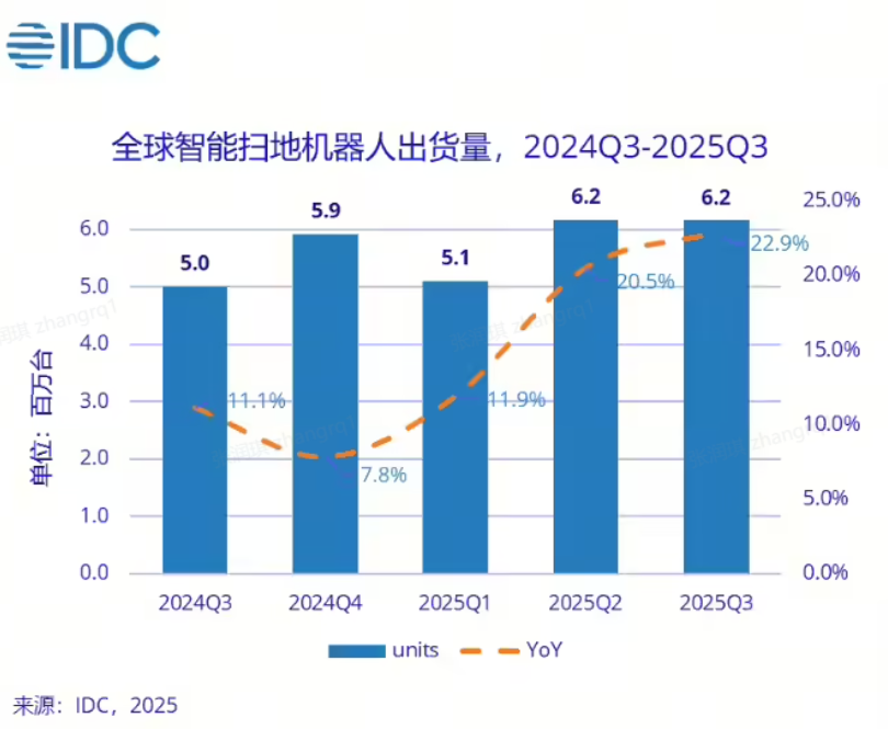 IDC 发布《全球智能家居设备市场季度跟踪报告,2025年第三季度》,2025 年前三季度,全球智能扫地机器人市场累计出货 1742.4 万台,同比增长 18.7%;其中三季度出货 616.1 万台,同比增幅达 22.9%。从厂商份额来看,中国厂商包揽全球出货量前五。