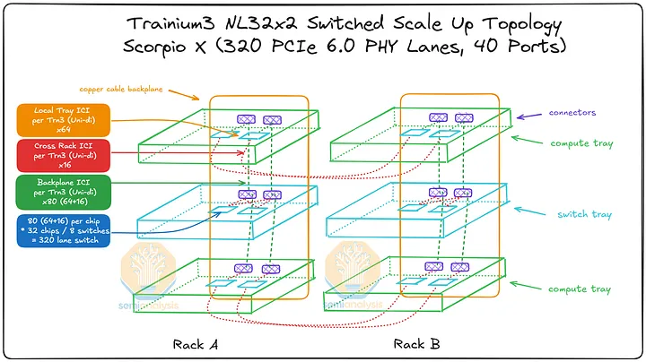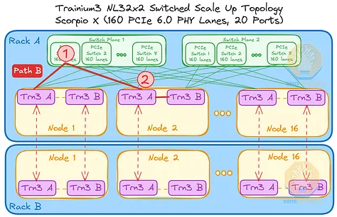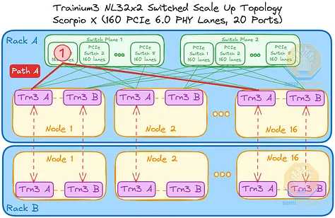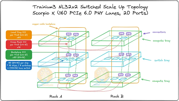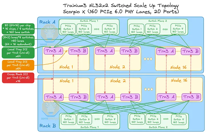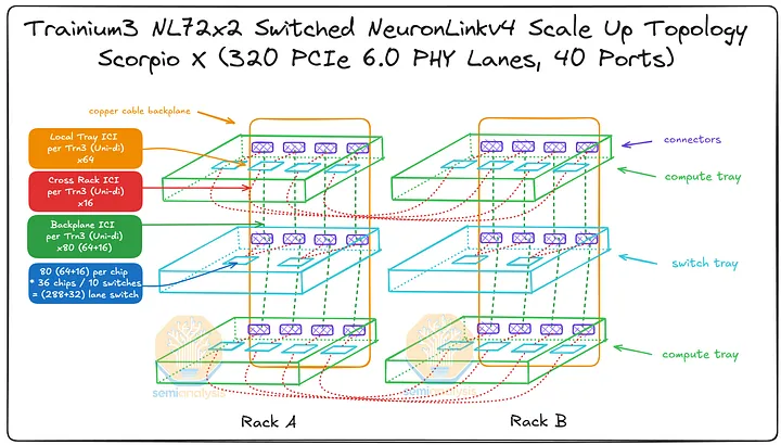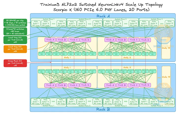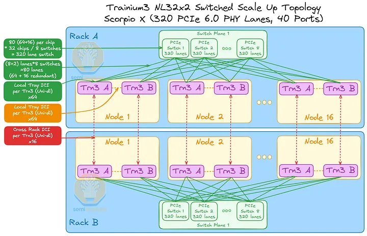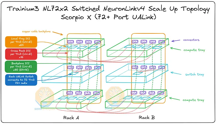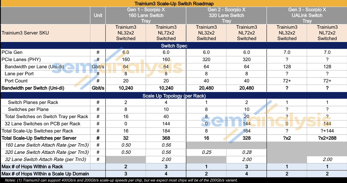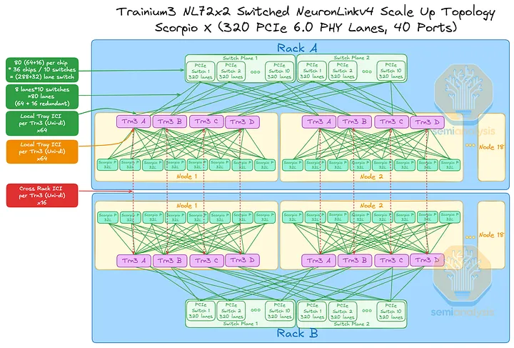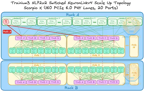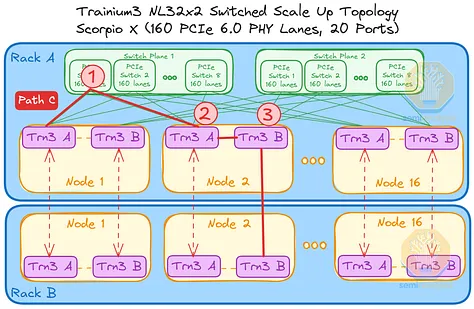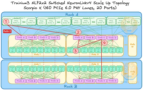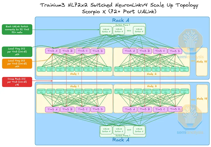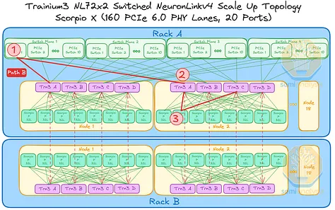 AWS 的NeuronLink目标是在尽可能实现供应链多样性的前提下,以最快的速度和最低的总体拥有成本将产品推向市场。其设计横向扩展网络架构的方法也遵循同样的原则。在 Trainium3 的生命周期内,共推出了三代横向扩展交换机:首先是 160 通道的 Scorpio X PCIe 6.0 交换机,然后是 320 通道的 Scorpio-X PCIe 6.0 交换机,最后还可以选择升级到更高基数的 72+ 端口 UALink 交换机。160 通道的 Scorpio-X 交换机可以实现快速上市,但缺点是它强制采用一种非理想的横向扩展网络拓扑结构,并非全连接,并且在同一 Trainium3 NL72x2 交换机架内的两个 Trainium3 芯片之间最多需要三个跳才能连接。然而,使用 320 通道的 Scorpio-X 交换机或 UALink 交换机可以改善这种情况。
