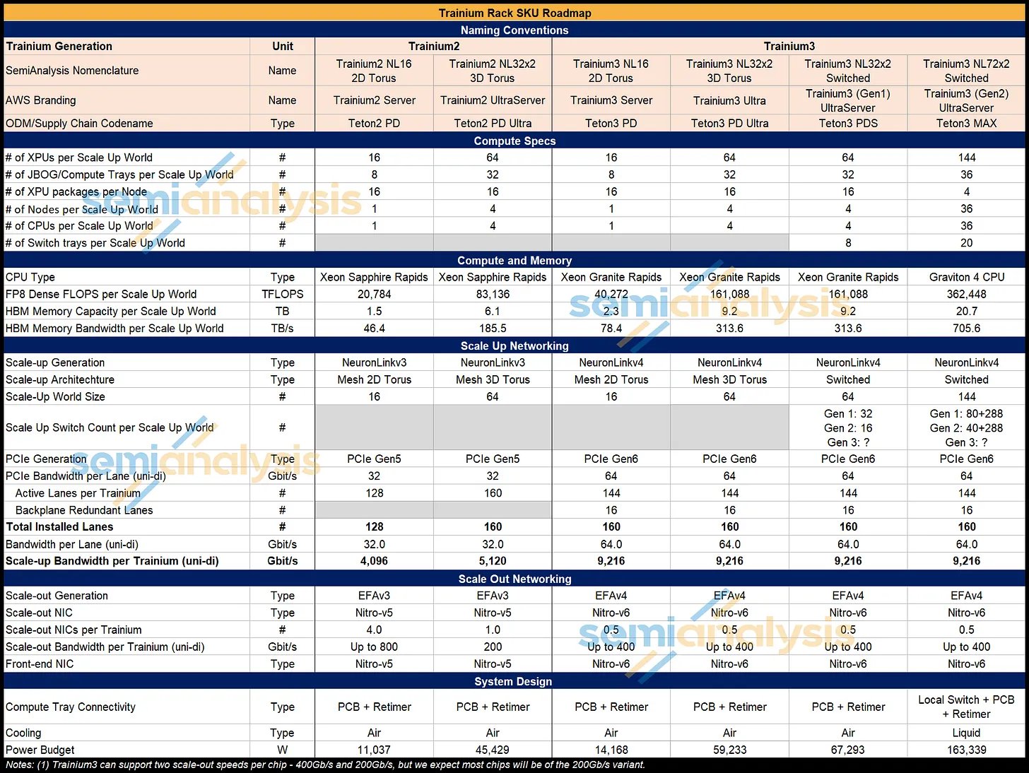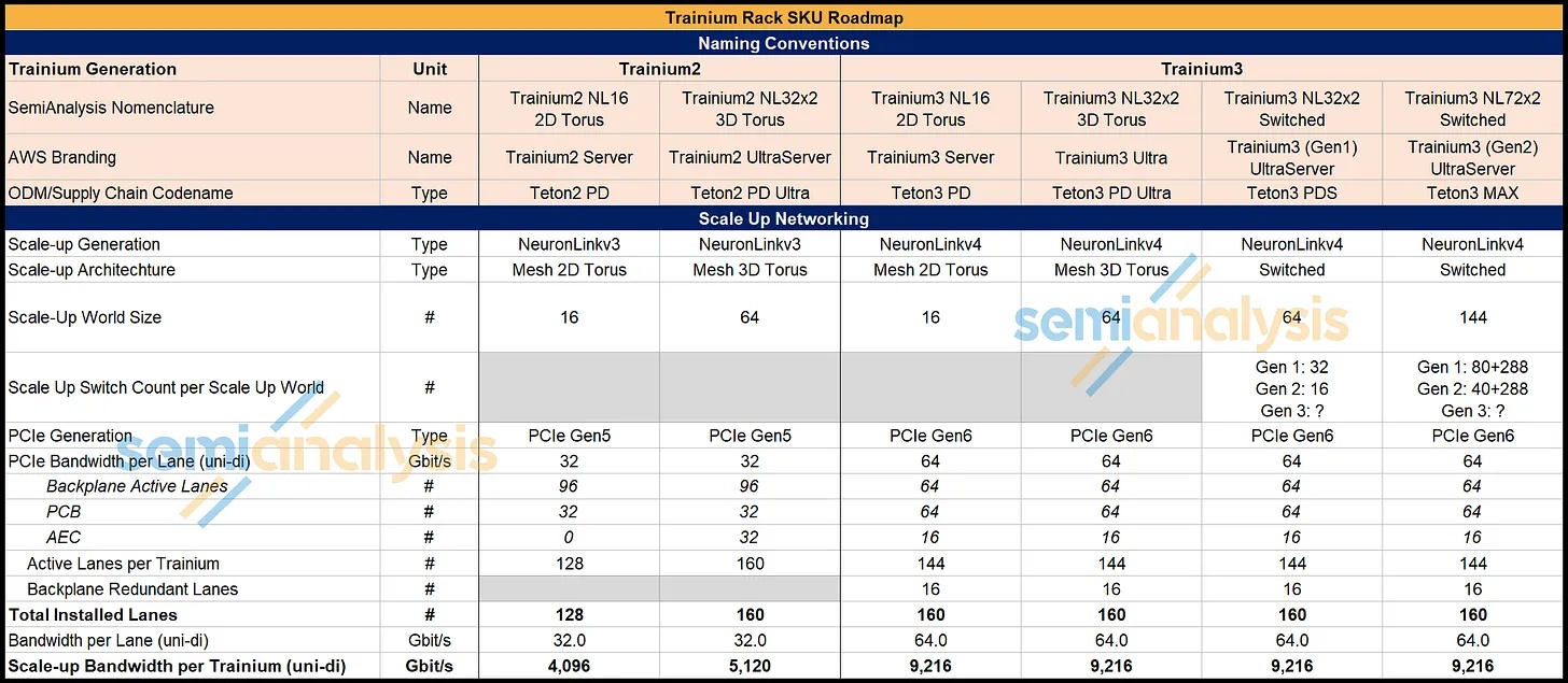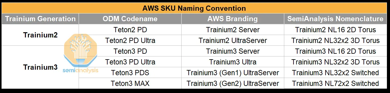 Trainium2 和 Trainium3 之间共有四个不同的服务器 SKU,供应链通常使用它们的代号来指代它们,这与 AWS 的品牌名称不同。