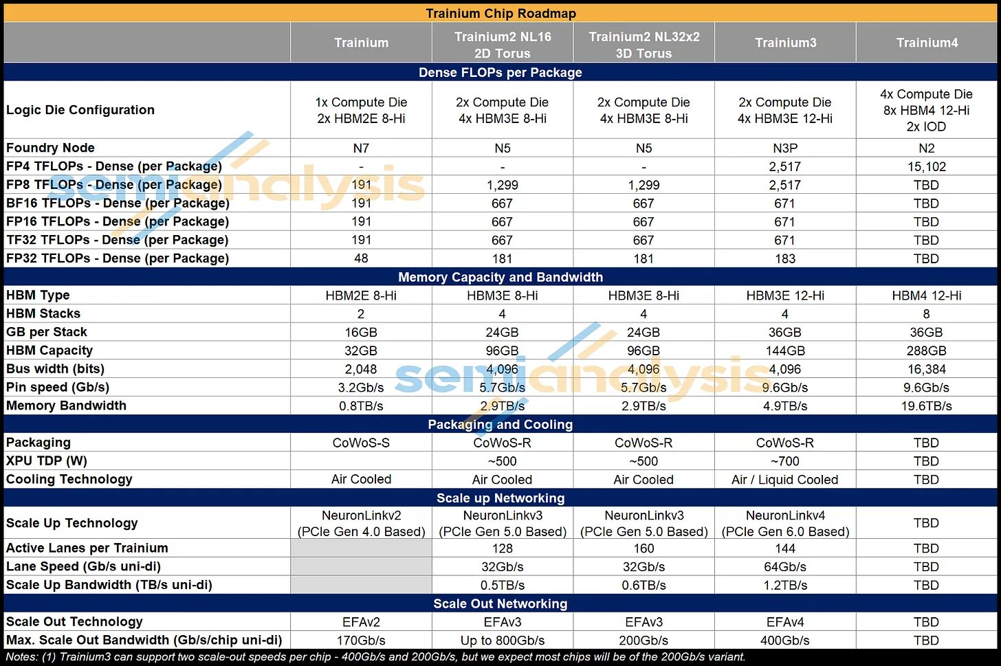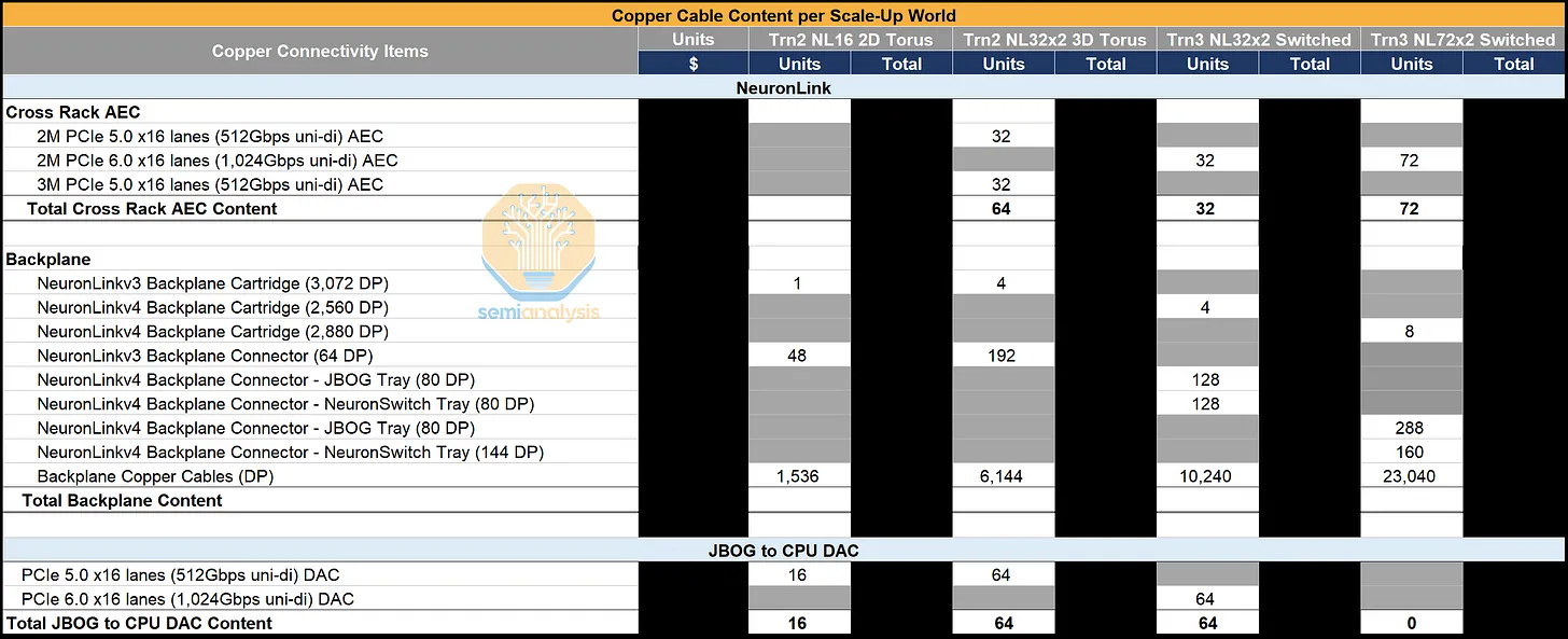由于不同 SKU 的扩展拓扑结构(交换机或网状网络)和 NeuronLink 通道数量不同,Trainium 各代产品的铜缆数量也各不相同。Trainium2 NL16 2D Torus 采用单背板和相对较少的 AEC 链路,而 Trainium NL32x2 3D Torus 则增加了通道数量,需要四个 NeuronLink 背板以及约 6,100 根铜缆来支持更密集的 3D Torus 拓扑结构。Trainium3 NL32x2 Switched 保持了类似的背板数量和约 5,100 根铜缆,而 Trainium3 NL72x2 Switched 则进一步扩展了扩展范围,每个服务器组可容纳 144 个芯片(Trainium3 NL32x2 为 64 个),铜缆数量也因此增加到 11,520 根。