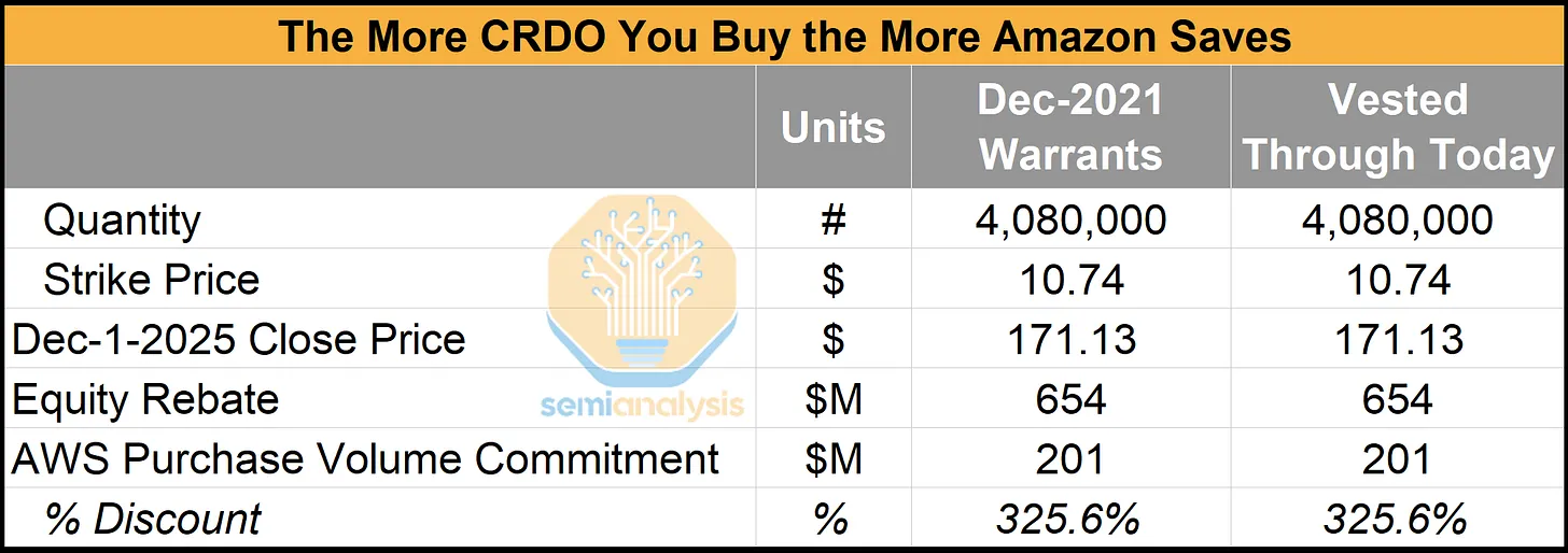 对亚马逊来说幸运的是,由于获得了 Credo 的股票返利,他们在 AEC 方面的交易比在 PCIe 交换机和重定时器方面更划算。Credo 的股票返利结构与 AWS 与 ALAB 的交易类似,但由于 AWS 在此协议中获得的认股权证数量远高于 ALAB,且此后 Credo 的股价大幅上涨,因此实际返利金额要高得多。这意味着亚马逊获得的 Credo 认股权证的价值超过了授予这些认股权证所需的支出。Credo 实际上是付钱给亚马逊,才让亚马逊购买了 AEC!