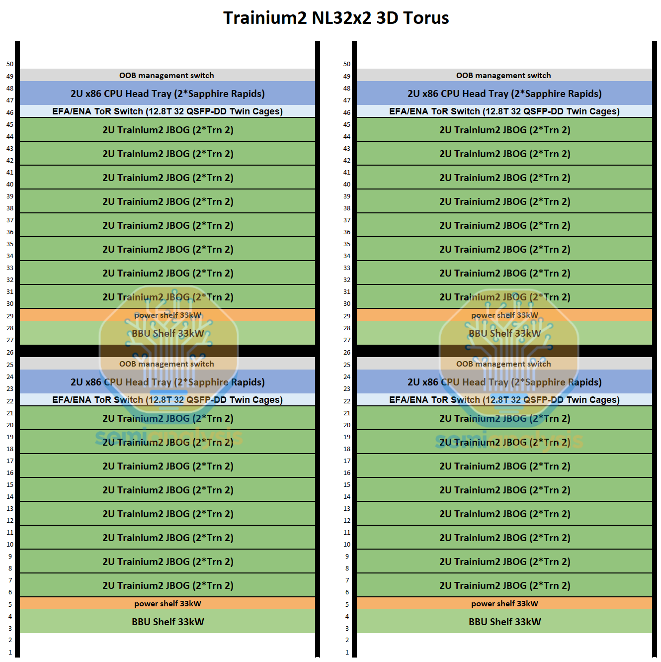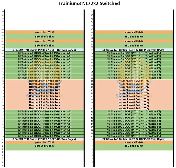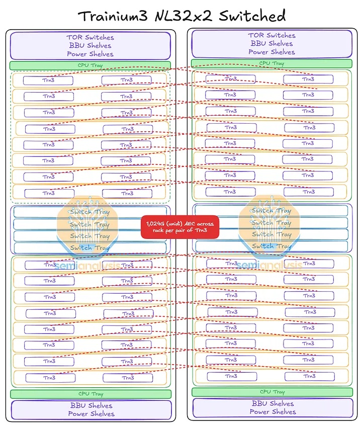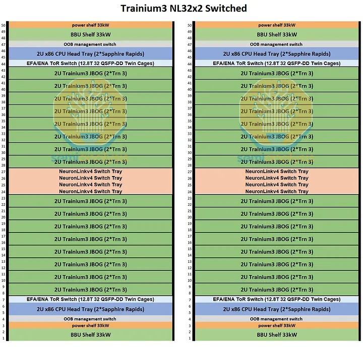 Trainium NL32x2 3D Torus 和 Trainium NL32x2 Switched 的主要区别在于,Trainium NL32x2 Switched 在机架中间增加了可扩展的 NeuronLink 交换机托架,从而实现了全对全交换网络。NeuronLink 交换机托架之所以放置在机架中间,原因与 Nvidia Oberon 机架中 NVLink 交换机托架的放置位置相同,都是为了最大限度地缩短加速器和可扩展交换机之间最长 SerDes 传输距离。此外,Trainium NL32x2 Switched 还将 CPU 托架、电源架、电池备份单元 (BBU) 托架和机架顶部 (ToR) 交换机的位置也进行了调整,从始终位于各自 8 个 JBOG 托架组的顶部,改为位于机架的顶部和底部,从而缩短了 16 个 JBOG 托架和 4 个 NeuronLink 交换机托架之间的距离。此外,还将推出配备五个 NeuronLink 交换机托架的设计,支持热插拔交换机托架,无需停机。这与英伟达的 GB200/300 NVL72/VR NVL144 形成鲜明对比,后者的操作员必须先清空机架上的所有工作负载才能更换交换机托架。亚马逊的理念始终以现场可维护性和可靠性为核心,因为他们在部署和管理中扮演着至关重要的角色。而英伟达则为了追求性能而忽略其他方面,因为这正是他们所追求的。