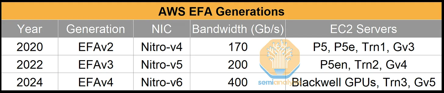 在 AWS Nvidia GPU 上,由于用户体验持续不佳,我们仍然认为 EFA 相较于 Spectrum-X、InfiniBand 或配备 Connect-X 的 Arista 交换机,性能并无提升。然而,Trainium 的用户体验要好得多,这得益于 AWS 能够控制 Trainium 的整个堆栈。