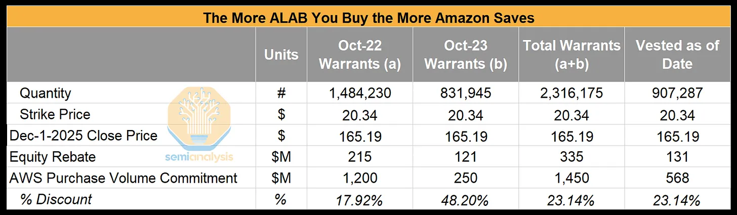 如果 AWS 达到其对 ALAB PCIe 交换机和重定时器的采购量承诺,它将获得与这些产品采购挂钩的 ALAB 股票认股权证。这些股票认股权证会在 AWS 达到采购里程碑时逐步生效,由于行权价格仅为 20.34 美元,任何高于该价格的市场价格都会立即为 AWS 带来价值。这种结构实际上为 AWS 提供了基于股权的组件采购“返利”。在以下示例中,截至 9 月 25 日生效的股票认股权证相当于约 23% 的有效折扣。
