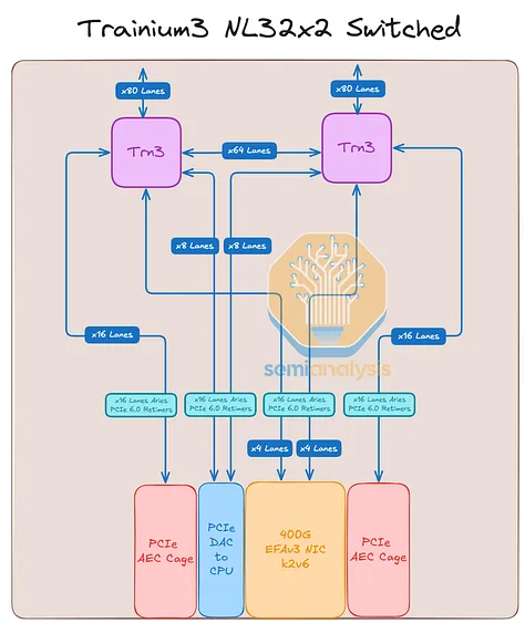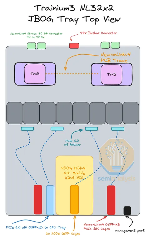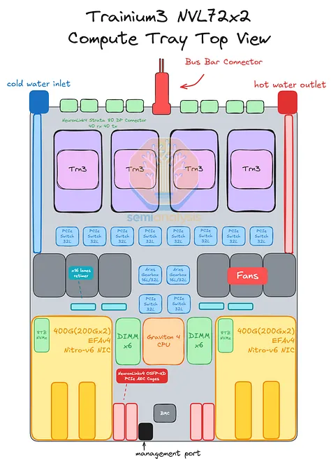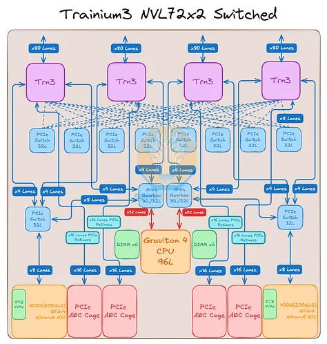 不过,Trainium3 NL72x2 交换机版与普通版的区别在于,主机 CPU 位于计算托架上,而专用于 CPU 的 Nitro-V6 (2*200) 400Gbps 网卡模块也位于该托架内。此外,借助 PCIe 交换机,CPU 还可以使用 Trainium3 专用网卡与外部网络通信。