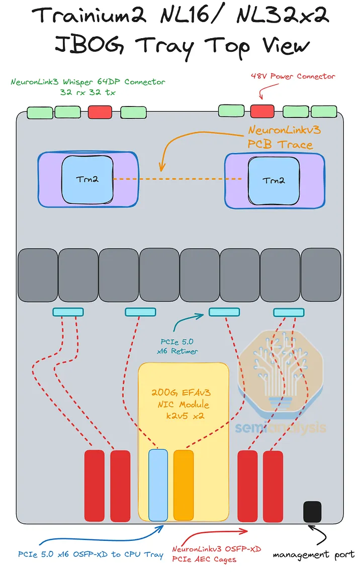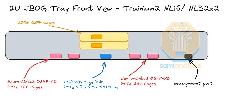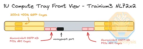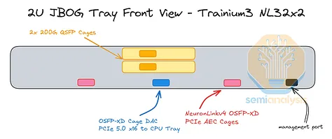 Trainium3 NL32x2 Switched 的 CPU 托架布局与 Trainium2 NL16 2D Torus 的布局非常相似,在Trainium2 文章中有详细说明。