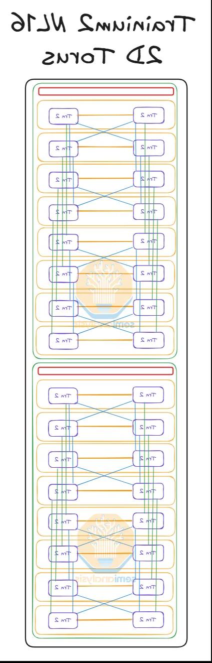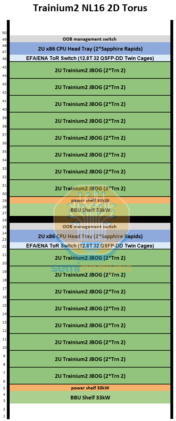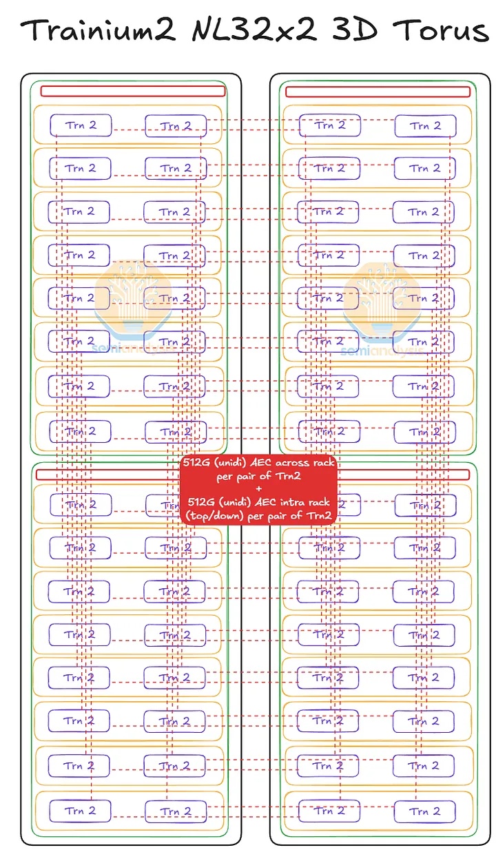 简要回顾一下 Trainium2 SKU——Trainium2 NL16 2D Torus 和 Trainium2 NL64 3D Torus SKU 的主要区别在于扩展世界的大小。Trainium2 NL16 2D Torus 在整个扩展世界大小下占用半个服务器机架,该世界大小包含 16 个 Trainium2 设备,构成一个 4x4 网格的 2D 环面。而 Trainium2 NL32x2 3D Torus 则由四个 Trainium2 NL16 2D Torus 半机架服务器连接而成,总共占用两个机架。这四个 Trainium2 NL16 2D Torus 半机架服务器通过 AEC 连接,从而创建一个包含 64 个 Trainium2 设备的 4x4x4 3D 环面。