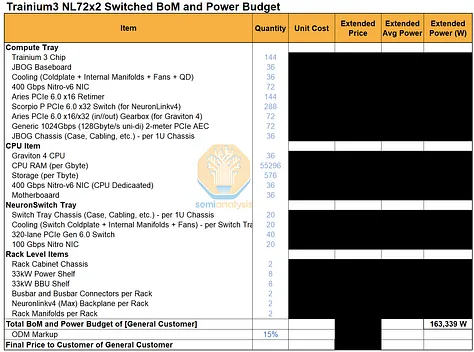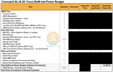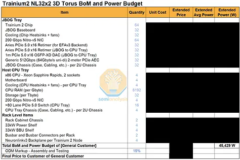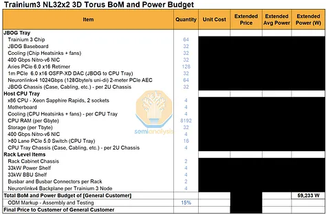 我们已针对不同 Trainium 系统中的主要组件组,编制了一份详细的零件清单和主要功耗预算。订阅我们AI 总拥有成本 (TCO) 模型和 AI 硬件物料清单 (BoM) 模型的用户,可以查看有关数量、平均售价 (ASP) 和系统总成本的详细信息。