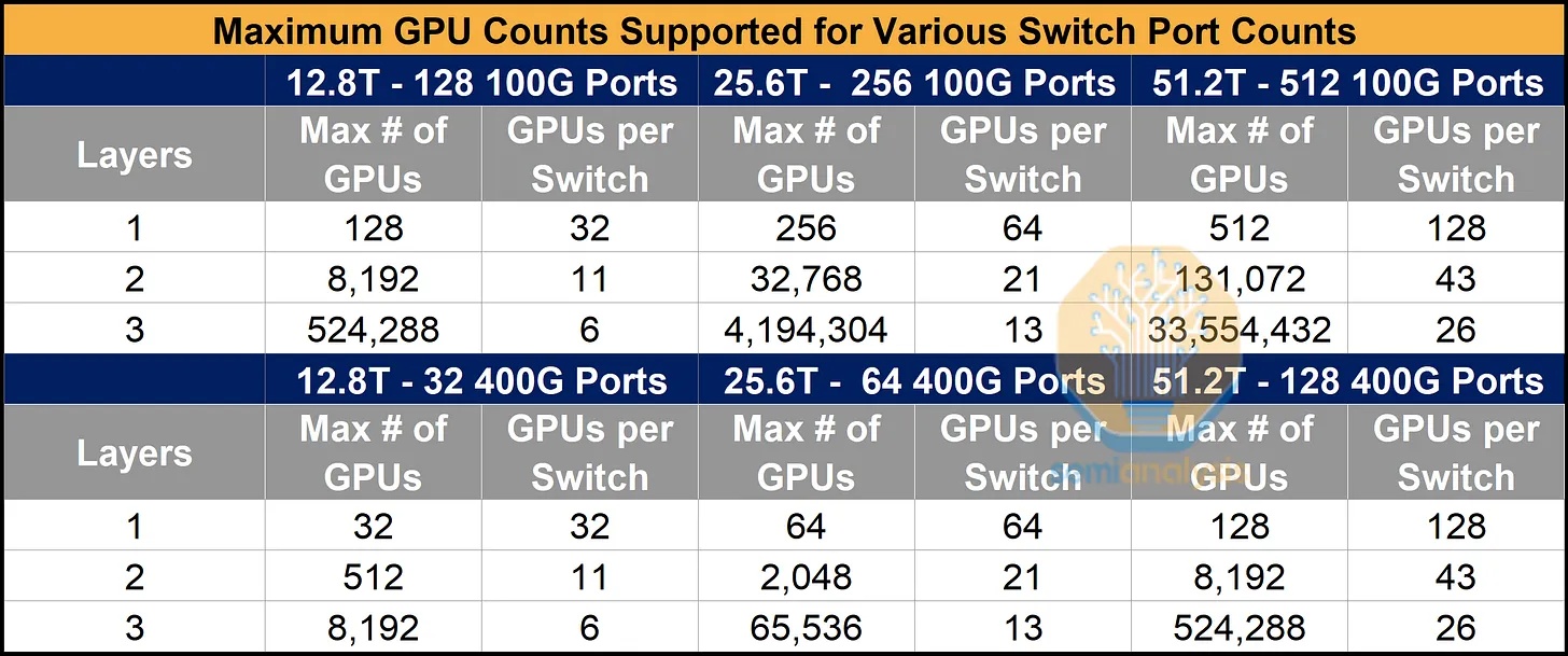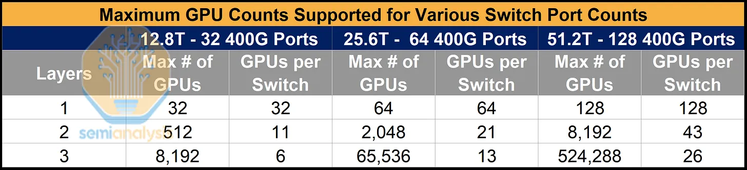 大多数Neocloud和超大规模数据中心的默认网络配置采用每个逻辑端口400G或800G的带宽,与网卡带宽相匹配。例如,Nvidia针对2000个GPU的H100集群的参考架构将使用25.6T QM9700 InfiniBand交换机,这些交换机配备64个400G的逻辑端口,与CX-7网卡提供的每个GPU 400G的带宽相匹配。交换机的带宽限制意味着,由64端口交换机构建的两层网络最多只能服务2048个GPU。