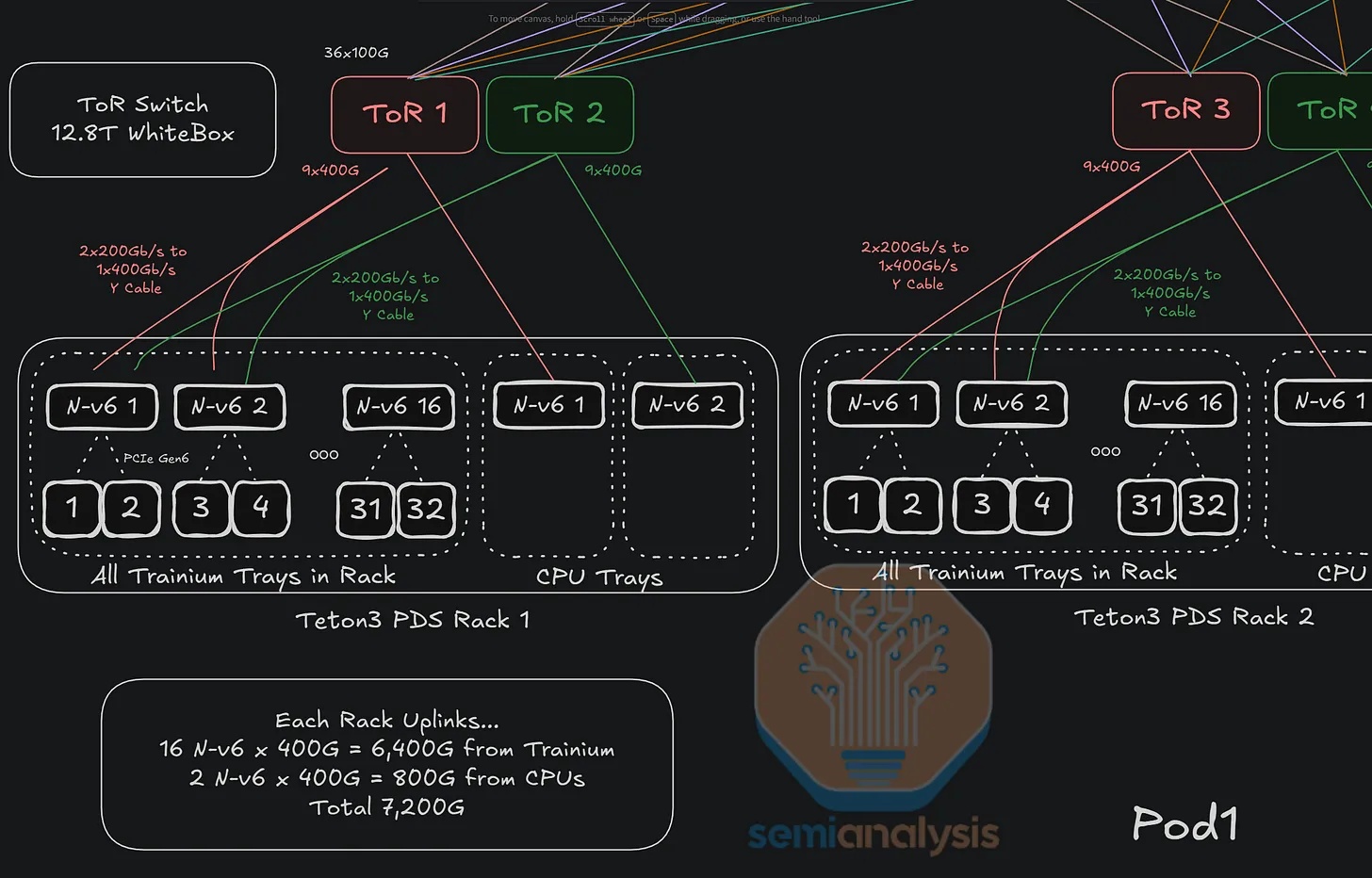 在每台 Trainium3 芯片支持 200G 带宽的版本中,每块 400G Nitro-v6 网卡将支持两颗 Trainium3 芯片。AWS 采用双机架顶部 (ToR) 设计,其中一块 Nitro-v6 网卡支持两条 200G 链路,分别连接到位于计算托架上方的两台 ToR 交换机。网卡端的 56G SerDes 通道通过一根带齿轮箱的 400G Y 型有源铜缆 (AEC) 转换为 ToR 端的 112G SerDes 通道,用于 Trainium 托架;而两台 CPU 托架则通过一根直连 AEC 或直接有源铜缆 (DAC) 连接到同一对 ToR 交换机。