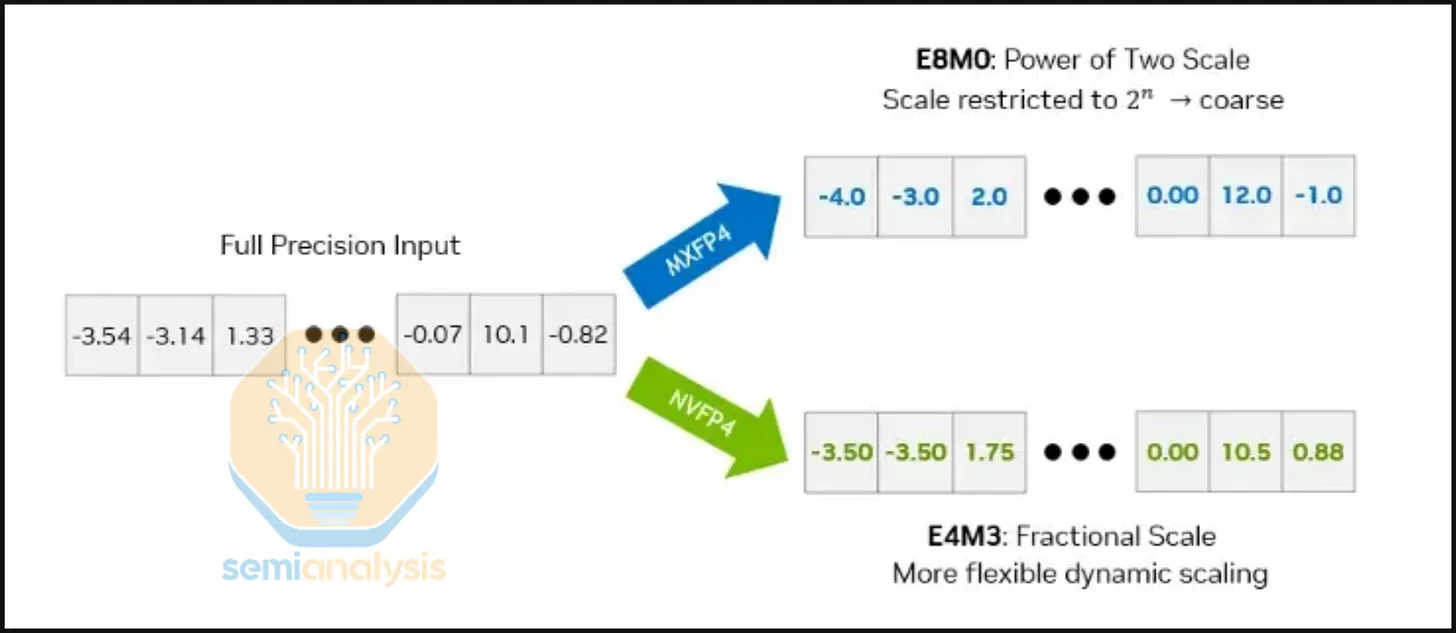 此外,Trainium3 不支持 NVFP4(块大小 16,块缩放格式 E4M3),仅硬件支持 OCP MXFP4(块大小 32,块缩放格式 E8M0)。这意味着与 Nvidia GPU 相比,Trainium3需要更高级的 QAT/PTQ 技术。E8M0 块缩放比 E4M3 块缩放更差的原因在于,E8M0 会将缩放因子精确到最近的 2^n,从而导致更严重的量化误差。虽然 Trainium3 在技术上支持 NVFP4 作为存储格式(或任何 4 位任意存储格式),并且可以支持在线解量化到 OCP MXFP8,但它本身并不提供硬件加速的 NVFP4 到 OCP MXFP8 解量化支持,必须通过软件驱动的方式实现。