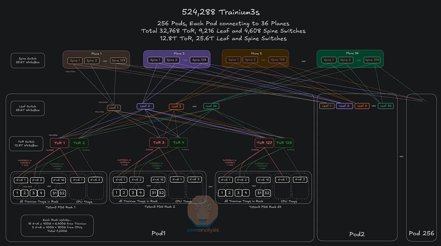将叶脊层交换机替换为 25.6T 交换机,而非 12.8T 交换机,意味着在相同的三层网络中可支持的 Trainium3 芯片数量将增加 4 倍,同时 pod 数量和每个 pod 的机架数量也将翻倍。如果将叶脊层交换机升级到 51.2T,则该网络中的芯片数量将再次增加四倍。
