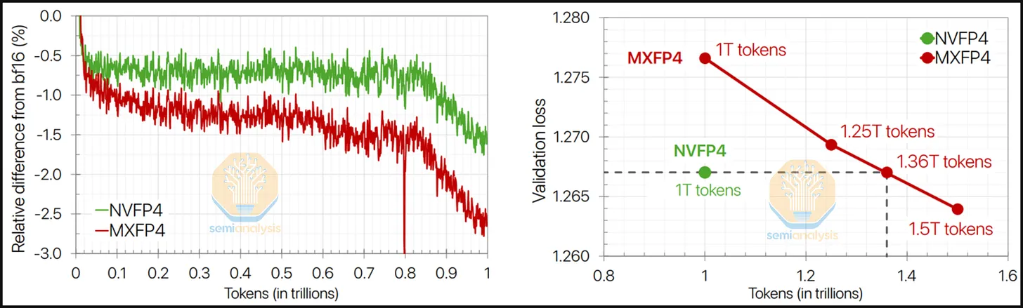 Trainium3 不支持 NVFP4 使得 4 位训练变得更加困难。英伟达研究院(以及英伟达市场部)最近发布了一篇关于 NVFP4 训练的研究论文,其中展示了一种实验性的训练方案,该方案在前向传播和反向传播中都使用了 4 位浮点运算。我们认为,在未来 12 个月内,西方前沿实验室不太可能在前向传播和反向传播中都采用 4 位浮点训练,但我们认为,随着训练方案的成熟,他们最终可能会转向 4 位训练。