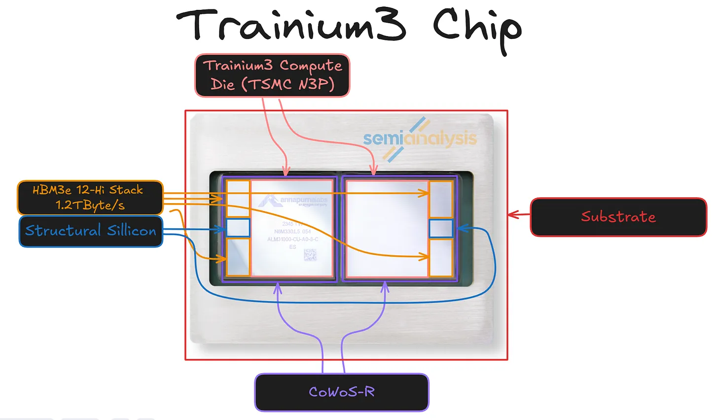 能够解读芯片标识的读者会发现,上图所示的封装正是Trn2,而我们也正是采用了这款芯片,因为它的封装布局与Trainium3完全相同。该封装由两个CoWoS-R组件构成,而非一个大型中介层。两个计算芯片通过基板相互连接。