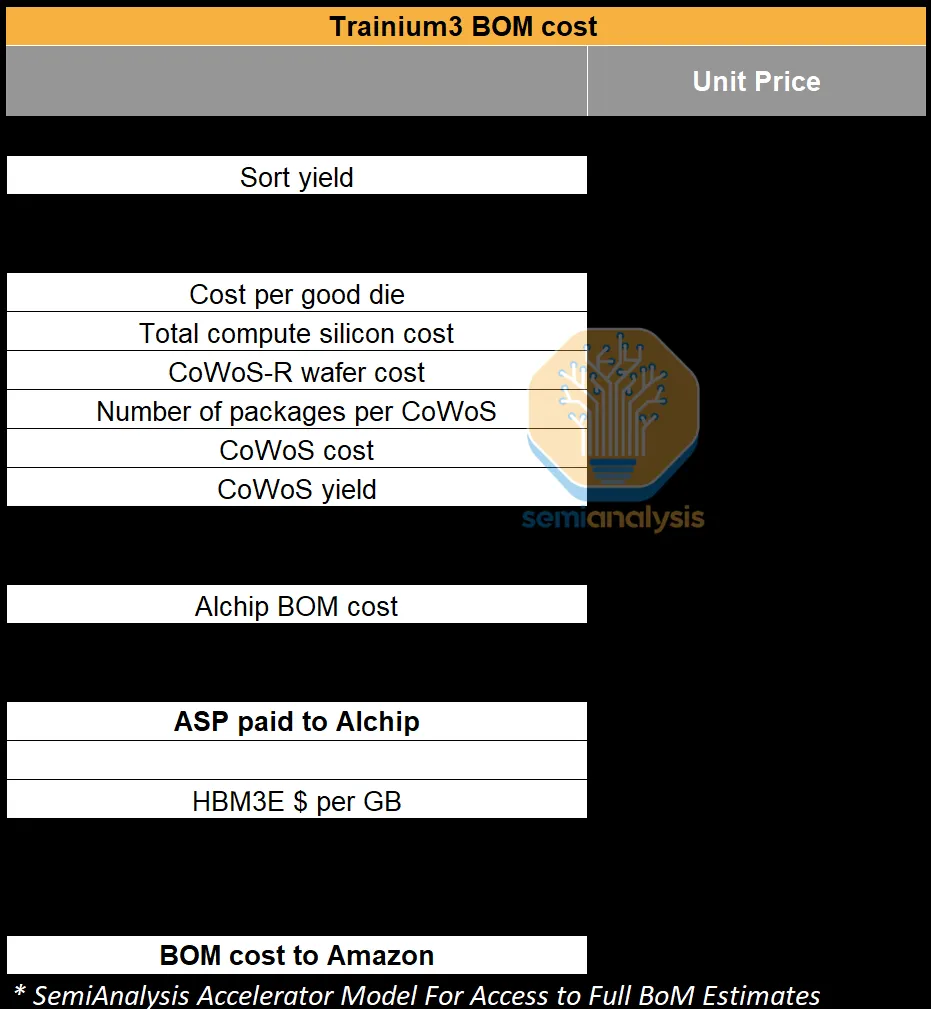 有趣的是,有两个流片项目,一个由Alchip拥有(称为“Anita”),另一个则由Annapurna直接拥有(称为“Mariana”)。在Anita项目中,Alchip直接从台积电采购芯片组件;而在Mariana项目中,Annapurna也直接采购芯片组件。大部分产量将用于Mariana项目。虽然Alchip在Mariana项目中的设计参与度与Anita项目类似,但他们从Mariana项目获得的收入应该会低于Anita项目。亚马逊和Annapurna都非常注重成本控制,并对供应商施加了很大的压力。与博通的ASIC交易相比,Trainium项目留给芯片设计合作伙伴Alchip和Marvell的利润空间要小得多。就每总拥有成本(TCO)的性能而言,Annapurna更加重视降低TCO。