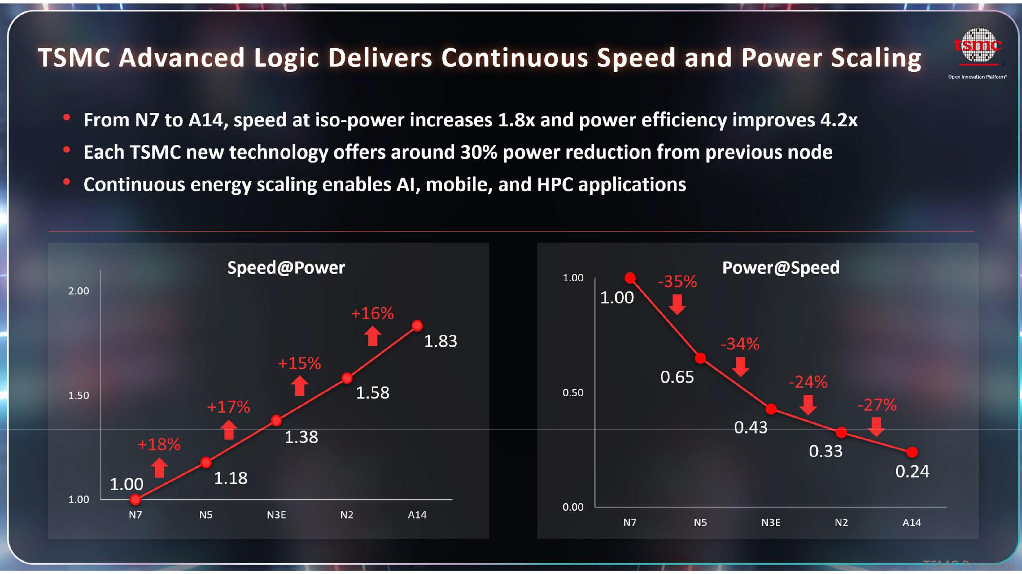 根据幻灯片显示,从N7(2018年工艺节点)升级到A14(2028年工艺节点),在相同功耗水平下性能提升1.83倍,能效提升4.2倍,这看起来非常显著。然而,这两项技术之间相隔十年之久。台积电还指出,每一代新的主要工艺节点相比上一代节点都能降低约30%的功耗。相比之下,主要节点的性能提升幅度仅为15%至18%,这在一定程度上表明,台积电在设计这些制造工艺时,更关注的是功耗控制。