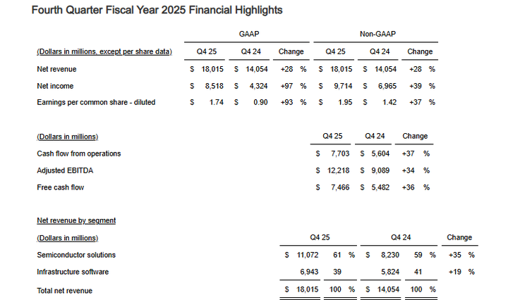 博通第四财季营收180.1亿美元,同比增长28%,市场预期为184.8亿美元;净利润97.1亿美元,同比增长39%,调整后每股净利润1.95美元,同比增长37%。2026财年第一季度营收指引约为191亿美元,较上年同期增长28%,2026财年第一季度调整后息税折旧摊销前利润指引为预计营收的67%。