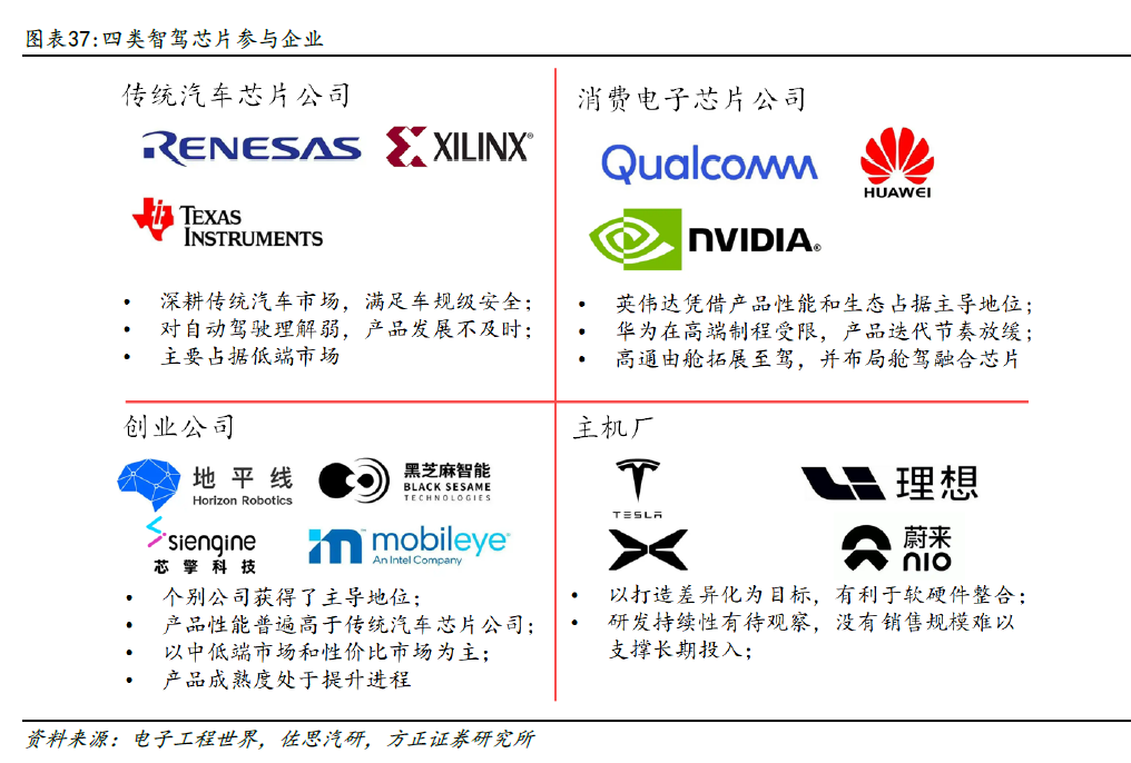 ① 传统汽车芯片公司:瑞萨、赛灵思、德州仪器等,原本是微控制器(MCU)、功率半导体、传感器、电源管理芯片等。优势在传统汽车电子基础,能满足车规级安全。但劣势在AI能力偏弱且产品迭代速度慢,对数据驱动的智能驾驶场景理解不足,因此产品在L2及以下的低端市场。