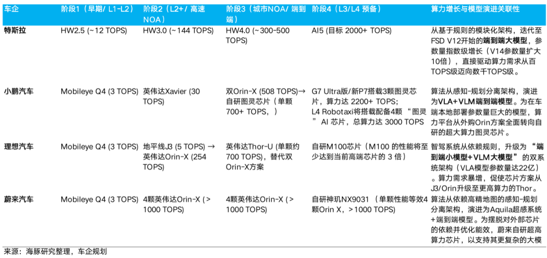 从头部车企的规划来看:特斯拉FSD V14参数量(今年10月推送)相比V13扩大了10倍,其规划的AI5芯片算力也高达2000-2500 TOPS,是当前HW4.0算力的5倍(计划于2026年底投产)。