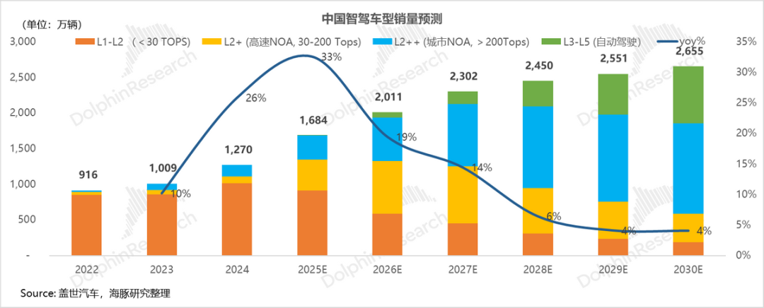 从销量维度来看:2024年中国乘用车销量2310万辆,智驾渗透率55%。海豚君预测到2030年,智能驾驶渗透率将达100%,其中L2+及以上渗透率达93%(对应约2655万辆智驾车辆)。