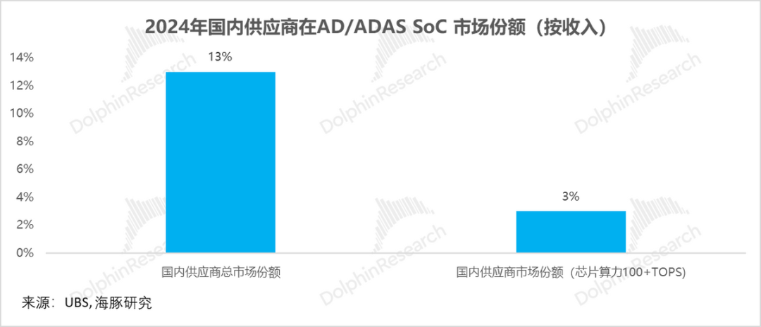 2024年,国内供应商的收入在中国车厂AD/ADAS SoC市场总规模中占比仅13%,主要是高单价中高端芯片市场(100+ TOPS)是英伟达等主导,导致国内供应商的份额被挤压至仅3%。因此,攻克并占领大算力市场,也已成为国产芯片实现替代、获取增长的关键路径。