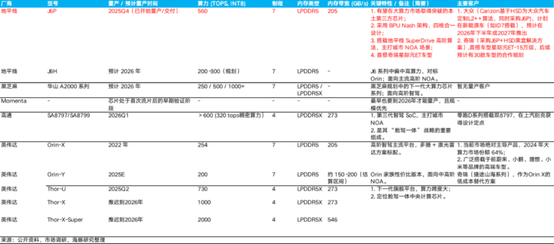 ③ 挑战者:地平线,黑芝麻,高通,Momenta等。其中,地平线旗舰产品(如J6P)已具备挑战高端市场的算力水平(560 TOPS),而挑战者也是未来格局最大变数。