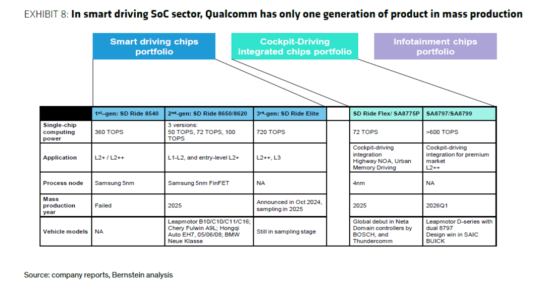 高通下一代智驾芯片侧重“舱驾一体”,把驾驶和座舱集成到一颗SoC中(如规划中的SA8797/SA8799等),将于2026年一季度量产。目前的定点车型为零跑D系列(搭载双8797芯片),未来大芯片市场可能有机会。