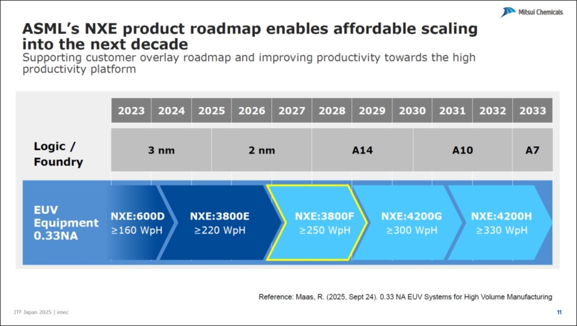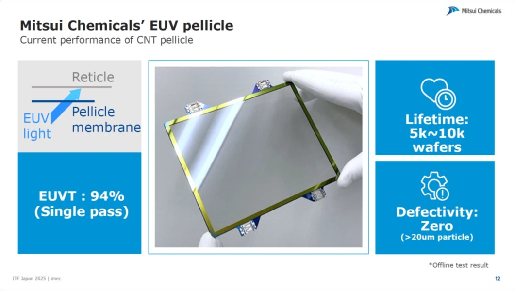 计划在 2027 年发布时为 NXE:3800F 配备碳纳米管薄膜。来源:平原昭夫(三井化学),“化学与合作:驱动未来半导体生态系统”(2025 年日本国际半导体技术博览会)演讲幻灯片