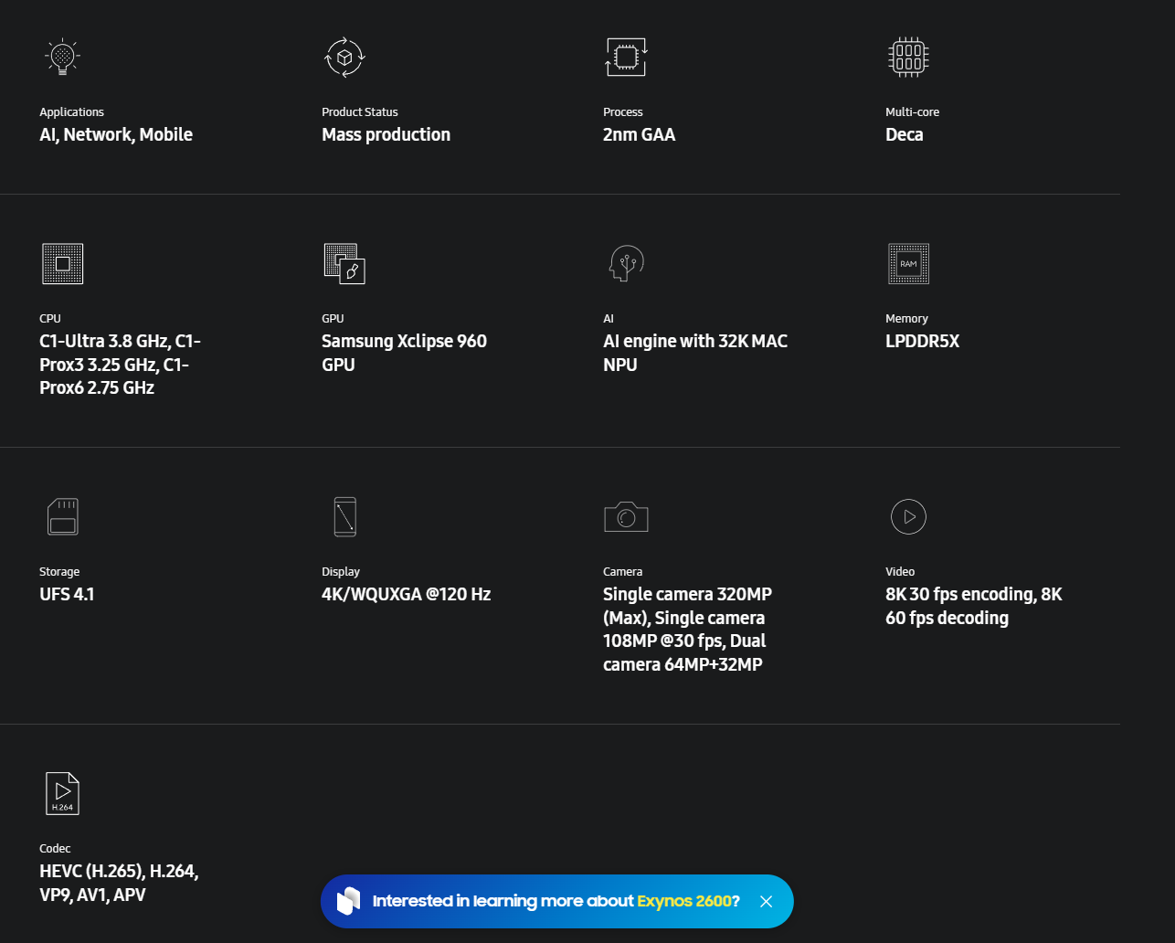 三星Exynos 2600今日正式在官网公布,采用了最新 Arm v9.3 架构的十核 CPU,基于三星电子 2nm GAA 制程,这也是全球首款 2nm GAA 智能手机 SoC,相比 Exynos 2500 在 CPU、GPU、AI 性能以及散热效率方面均有显著提升。