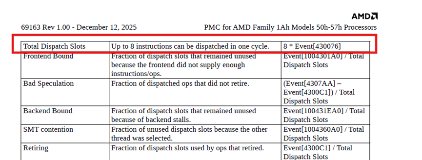 同时,Zen6引入了8路指令调度引擎(8-wide dispatch engine),比Zen5的6路设计更宽,是专门为更高吞吐量而设计的更宽架构,有助于处理向量计算,例如AVX-512指令集,从而提升整体并行能力和吞吐量。文档还提到Zen6配备特殊的计数器,并针对闲置调度窗口、后端流水线阻塞和线程选择耗损等进行了优化,预计Zen6在资源调度和多线程性能优化应该会有不错的表现。