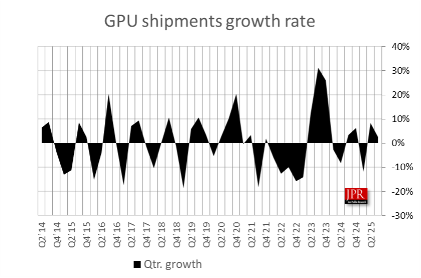 GPU方面,整体GPU出货量同比去年增长了4.0%,其中独立显卡出货量实现了10.7%的同比增长,而笔记本GPU的增长率为1.4%。