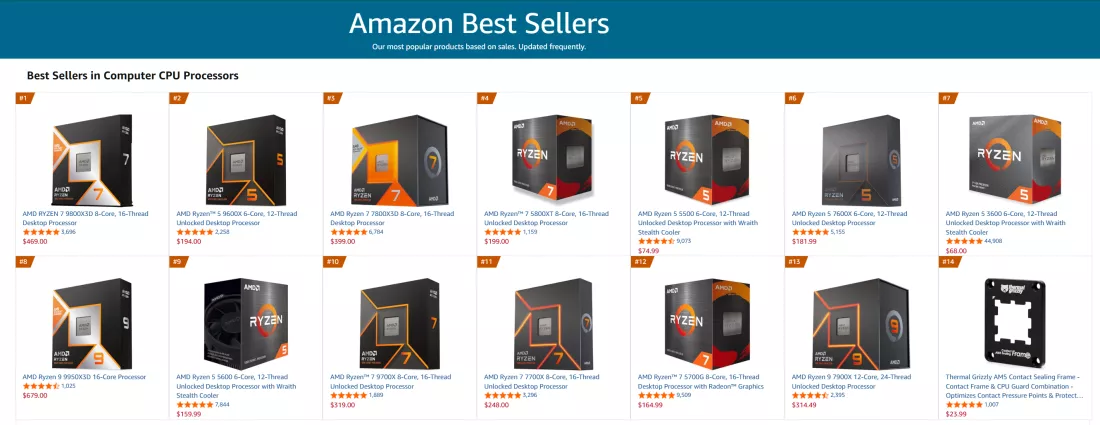 2024年11月,AMD在亚马逊最畅销CPU排行榜上占据绝对优势,包揽前12名。但一年多过去了,AMD是否还保持着这股势头呢?如今,亚马逊最畅销的14款处理器均为AMD产品,前20名更是占据了19席。