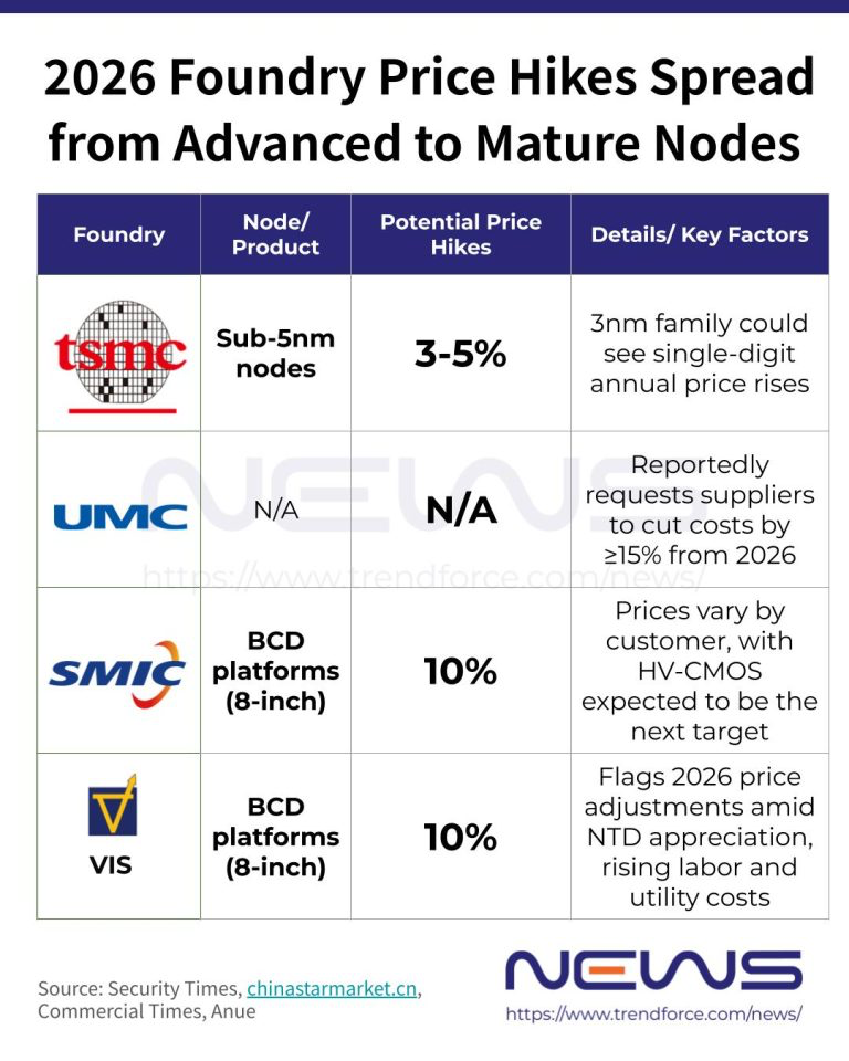 新一轮晶圆代工价格上涨浪潮正从先进工艺蔓延至成熟工艺。据报道,中国领先的晶圆代工厂中芯国际(SMIC)已上调部分生产线的价格;而chinastarmarket.cn网站则补充指出,台积电(TSMC)旗下的先锋国际半导体(VIS)也已通知客户类似的涨价,涨幅约为10%。