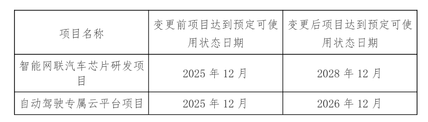 四维图新公告显示,基于对项目当前进度、行业技术发展趋势及资源配置效率的研判,结合项目整体推进规划与实际实施情况,经四维图新审慎研究,拟对“智能网联汽车芯片研发项目”、“自动驾驶专属云平台项目”达到预定 可使用状态的时间予以延期。