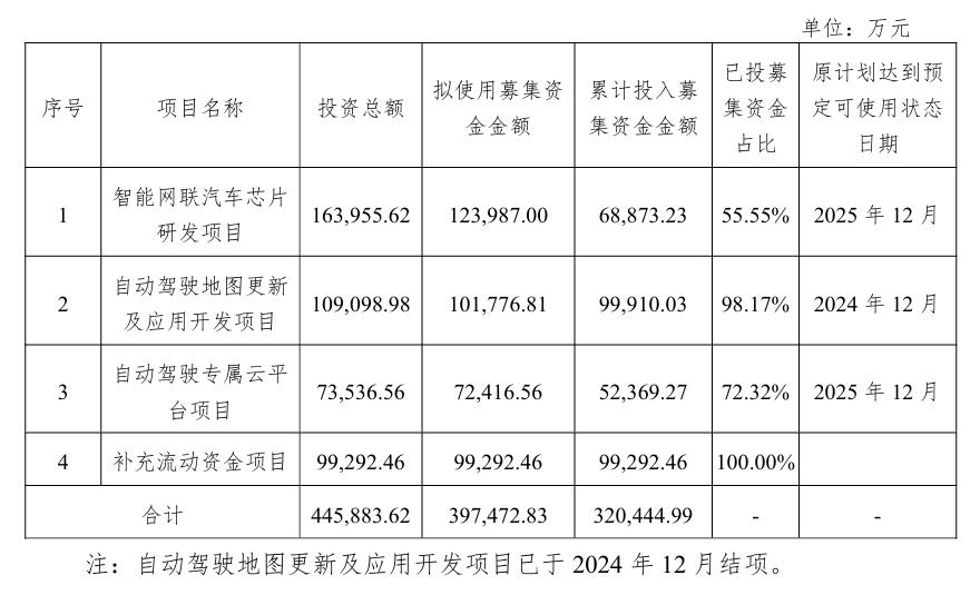 公告显示,截至2025年11月30日,四维图新募集资金投资项目基本情况如下图所示: