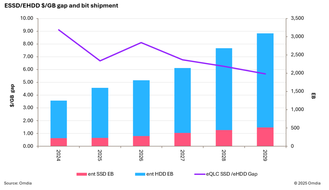 Omdia认为2026年是QLC ESSD的转折点——并非因为其将作为HDD的替代品,而是由于AI推理应用创造了极具吸引力的使用场景。HDD凭借经验证的可靠性和成本优势,仍是大规模近线存储的首选,承载数据中心超80%的数据容量。尽管当前NAND行业发展迅速,其扩张速度在未来十年内仍无法实现HDD的大规模替代。Omdia预计到2029年QLC ESSD与EHDD的成本差距将达6倍。