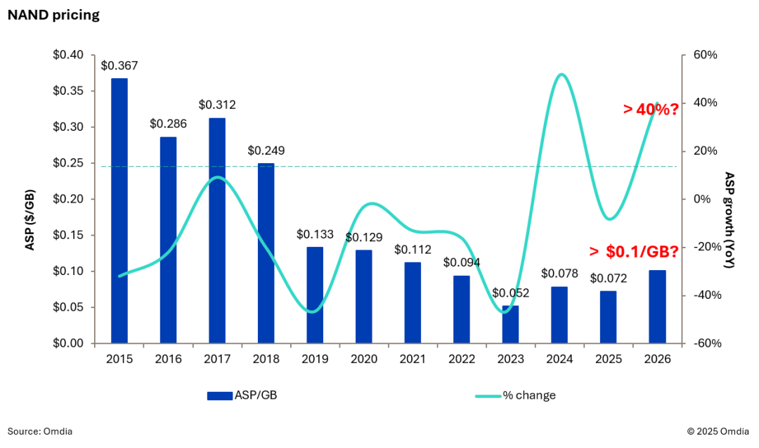 具体到NANA领域,Omdia认为,2026年AI需求推动NAND价格上涨40%。从下图可以看出,NAND价格在2017年达到峰值后,因供应过剩和需求疲软,价格持续下跌至2022年,并于2023年跌至多年低点。2024年的反弹是自2017年以来最强劲的复苏,由供应商削减产能利用率、库存正常化及CSP(云服务提供商)需求激增驱动。鉴于当前处于低位起点且供应条件趋紧,这一上涨趋势将明确延续至2026年。