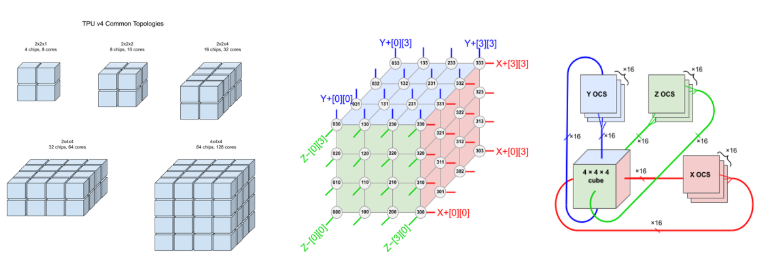 在 TPU PodSlice 中,TPU 芯片使用高速互连。每个 TPU 芯片直接与 TPU PodSlice 中的其他区域通信。TPU 软件会自动将数据分发到 PodSlice 中的每个 TensorCore。这里借用v4的连接结构作为图示说明。