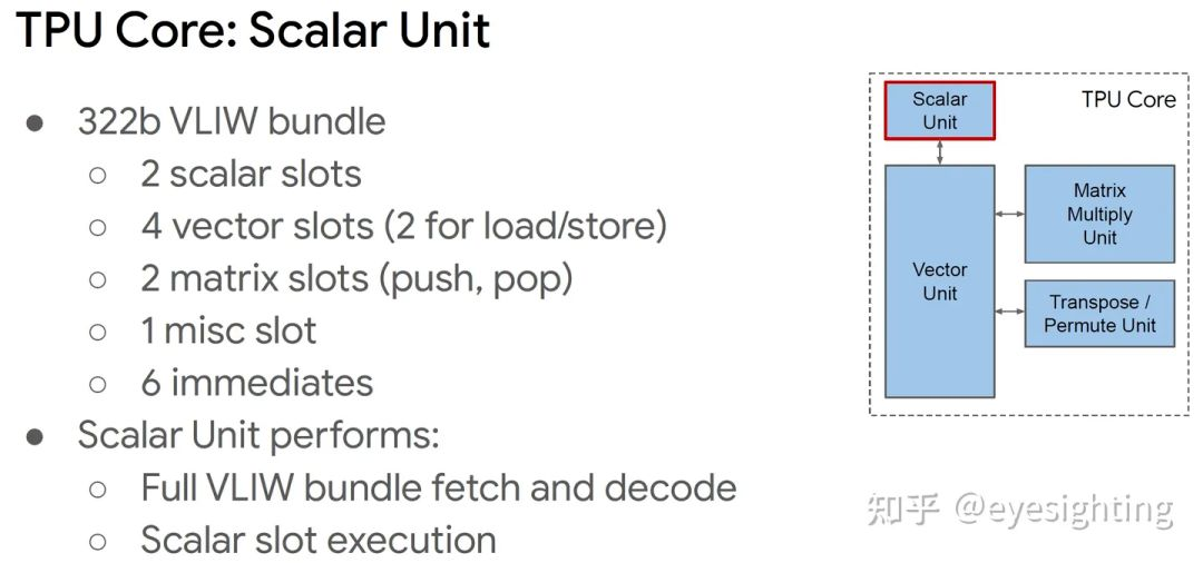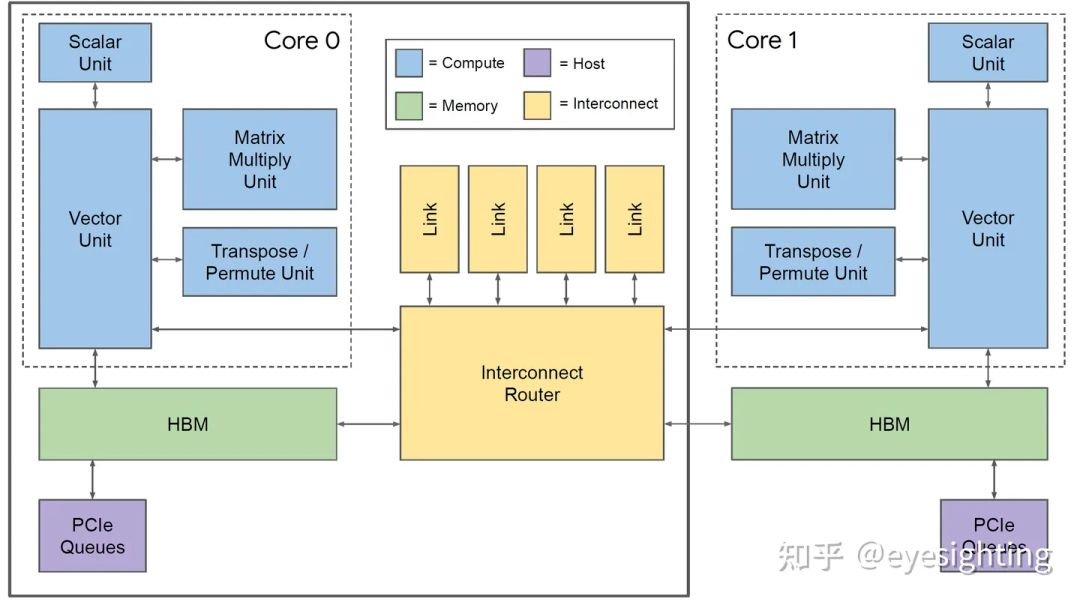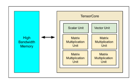 每个 v5e 芯片包含一个 TensorCore。每个 TensorCore 有 4 个矩阵乘法单元 (MMU)、一个向量单元(VU)和一个标量单元(SU),每个单元其实是大量计算电路组成的电路模块。可支持Training和Inference。