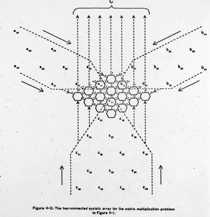 Kung 和 Leiserson 随后将 systolic system 的一个重要应用定位于 矩阵计算。许多基本的矩阵运算能够在具有数组结构的脉动网络上高效且优雅地进行流水线处理。例如,六边形连接的处理器阵列可以在执行矩阵计算时实现最优性能。这些脉动阵列具有通信路径简单且规则的特点,并且网络中几乎所有处理器都是同构的。正因如此,基于脉动阵列的专用硬件能够利用 VLSI 技术以低成本构建。