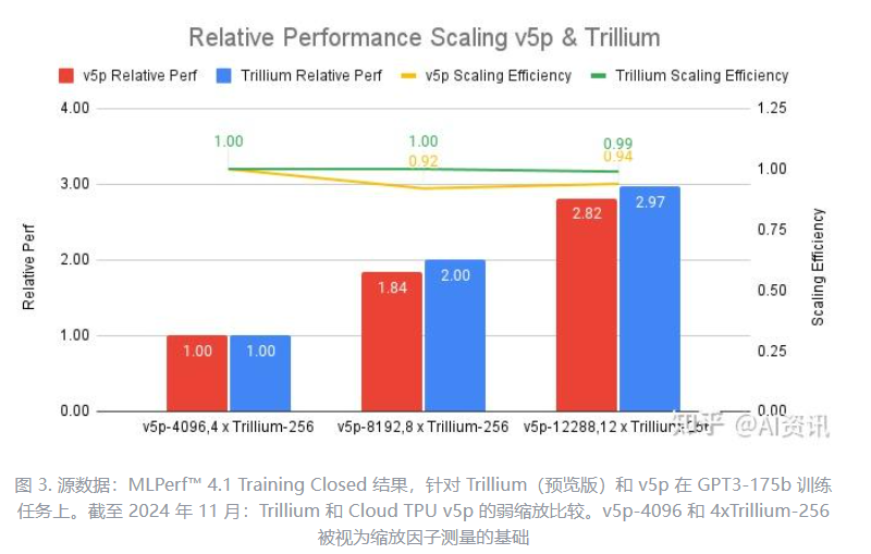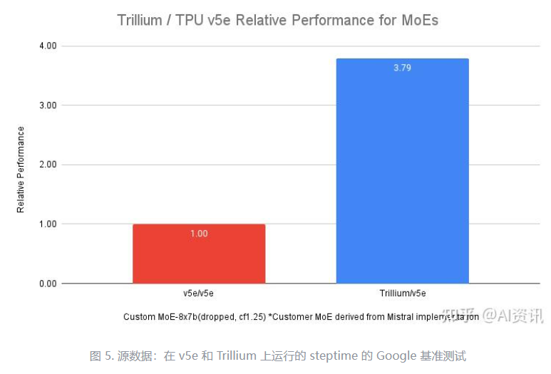 以下是 Trillium 相对于上一代产品的一些主要改进:训练效果提高 4 倍以上推理吞吐量提高 3 倍能源效率提高67%每块芯片的峰值计算性能显著提升 4.7 倍高带宽内存 (HBM) 容量加倍芯片间互连 (ICI) 带宽加倍单个 Jupiter 网络结构中有 100K 个 Trillium 芯片每美元可将训练性能提高 2.5 倍,每美元可将推理性能提高 1.4 倍