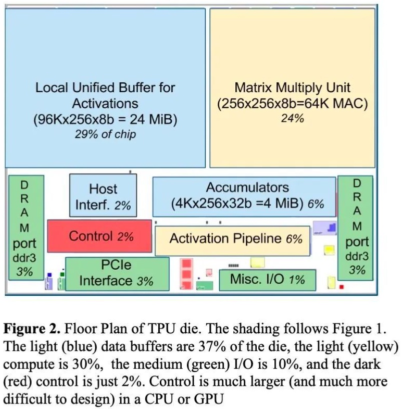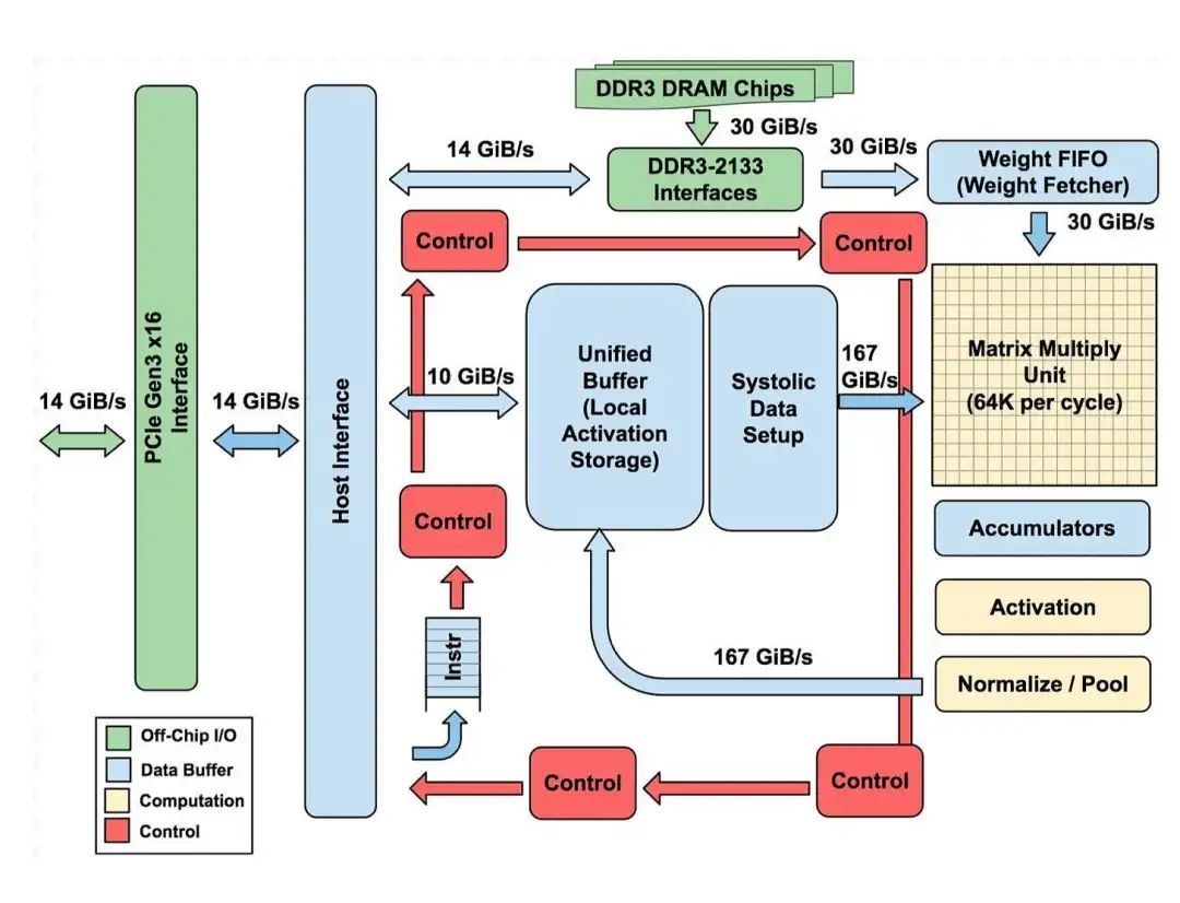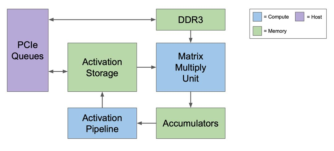 首先要注意的是,TPUv1 依赖于通过 PCIe(高速串行总线)接口与主机计算机的通信。它还可以直接访问自己的 DDR3 动态 RAM 存储。