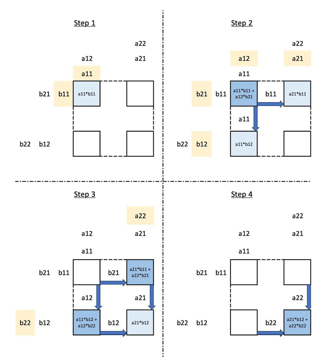 第 3 步:b21 被传输到右上角的 MAC,在那里它与新加载的值 a22 相乘,结果被加到之前存储的结果上。同时,a12 被传输到左下角的 MAC,在那里它与新加载的值 b22 相乘,结果被加到之前存储的结果上。在这一步中,我们计算了结果矩阵的右上角和左下角值。与此同时,a12 和 b21 被传输到右下角的 MAC,在那里它们被相乘,结果被存储。