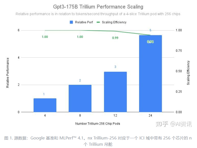 训练像 Gemini 2.0 这样的大型模型需要大量的数据和计算。Trillium的近线性扩展能力可以有效地将工作负载分配到通过 256 芯片舱内的高速芯片间互连和我们最先进的Jupiter 数据中心网络连接的大量 Trillium 主机上,从而使这些模型的训练速度显著加快。这是通过 TPU 多切片和用于大规模训练的全栈技术实现的,并通过Titanium进一步优化,Titanium 是一个动态数据中心范围的卸载系统,范围从主机适配器到网络结构。 Trillium 通过部署 12 个由 3072 个芯片组成的 pod 实现了 99% 的扩展效率,并通过 24 个 pod(包含 6144 个芯片)对 gpt3-175b 进行预训练实现了 94% 的扩展效率,即使在跨数据中心网络运行以预训练 gpt3-175b 时也是如此。
