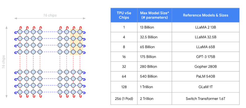 Cloud TPU v5e 支持对各种模型大小进行推理。单个 v5e 芯片最多可以运行具有 13B 参数的模型(16GB HBM)。可以基于数百个芯片运行具有多达 2 万亿(2000B)参数的模型,支持从BERT到GPT-4量级的不同模型。