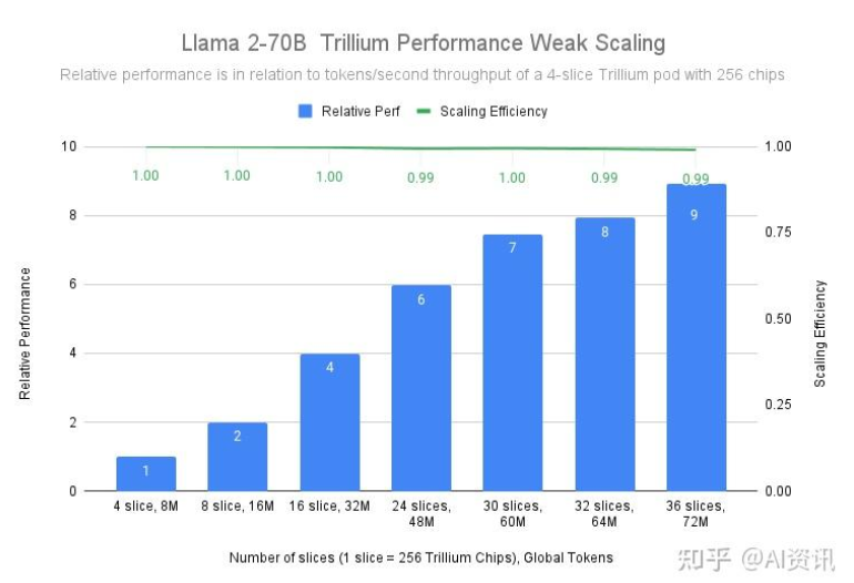 与前几代产品相比,Trillium TPU 的扩展效率明显更高。下图中,我们的测试表明,与同等规模的 Cloud TPU v5p 集群相比,Trillium 在 12 个 Pod 规模下的扩展效率高达 99%(总峰值浮点运算次数)。